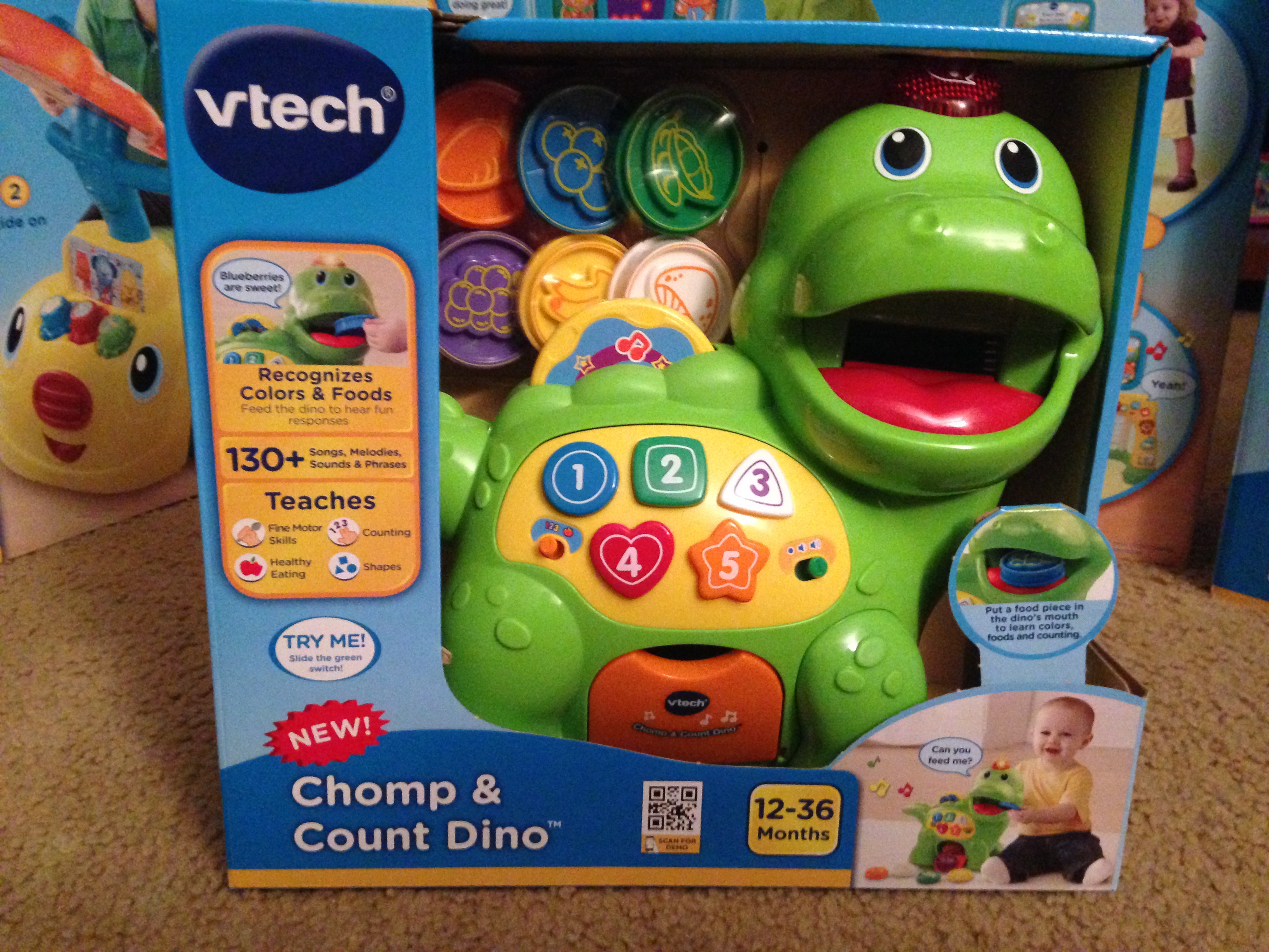 What does the Chomp & Count Dino do, exactly? Well, according to the info on the box and on VTech’s website, it does the following:
